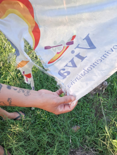 A bandeira do Movimento Baía Viva foi destruída (rasgada manualmente) neste ataque violento. O mastro foi quebrado e nos arredores dele tem marcas de pisoteamento.