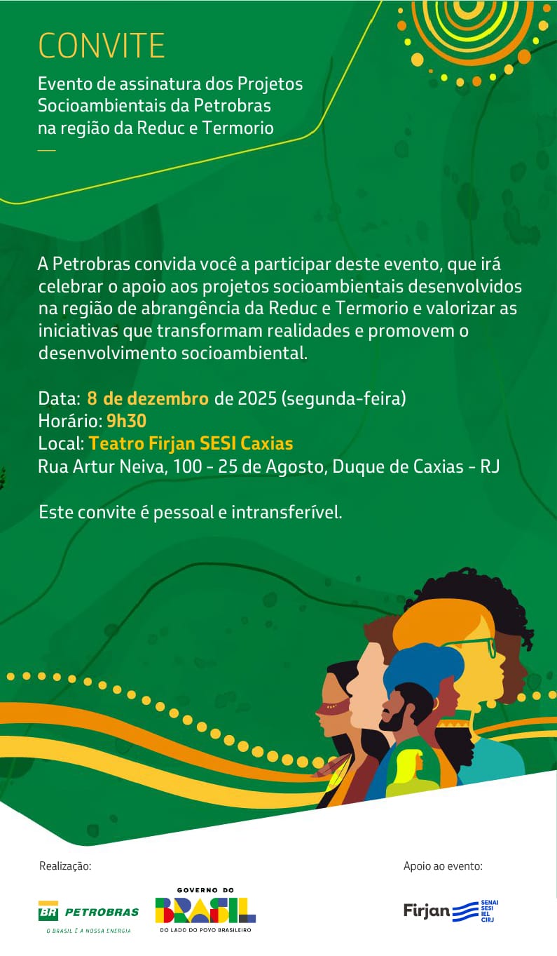 É com grande satisfação que encaminhamos convite para o evento de Assinatura de Projetos Socioambientais da Petrobras no dia 08/12/2025 às 9:30h Teatro Firjan SESI Caxias na R. Artur Neiva, 100 – Bairro 25 de agosto, Duque de Caxias, no qual o Centro de Formação em Economia do Mar (Baía de Guanabara) selecionado no segundo semestre de 2024 no âmbito do Edital Socioambiental Petrobras (2024).