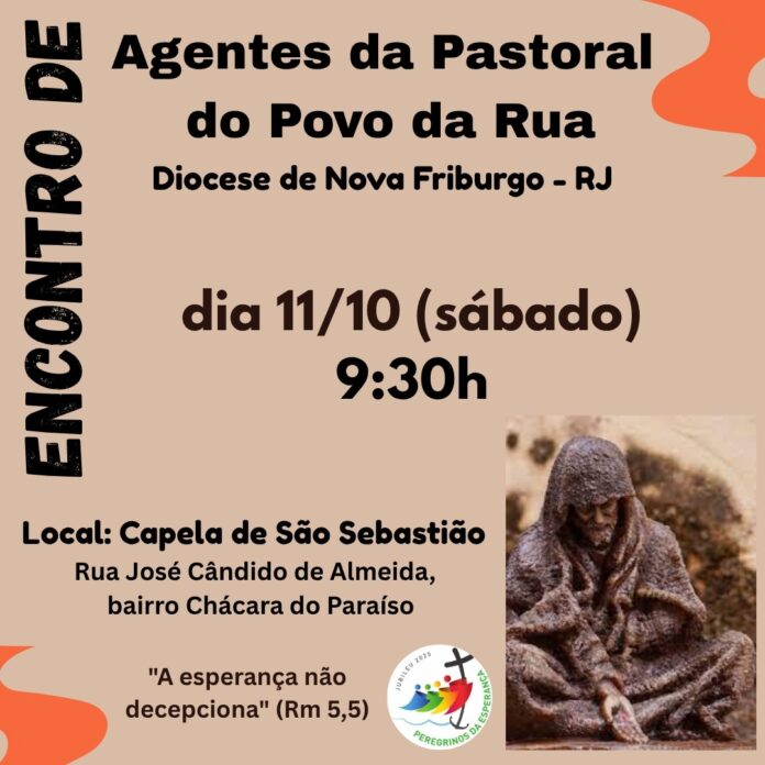 Você agente de pastoral ou pessoa interessada em ajudar a Pastoral do Povo da Rua é nosso convidado especial para participar do encontro que acontecerá no próximo sábado dia 11 de outubro, às 9h30, na Capela São Sebastião, na Chácara do Paraíso.