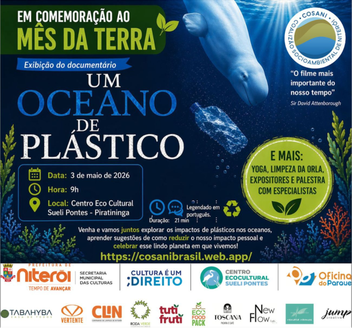 Em comemoração ao Dia Mundial do Terra (22 de abril), a Coalizão SocioAmbiental de Niterói (COSANI), em parceria com a Prefeitura Municipal de Niterói, Secretaria de Culturas, Centro Ecocultural Sueli Pontes, Vertente Ecoturismo, Tabahyba, New Flow Lab, RodaVerde, Espaço Holístico, CLIN, TutiFruti, Eco Food Pack, Toscana, Toscana, Jump Creative, tem o prazer em lhe convidar para a exibição do importante documentário: UM OCEANO DE PLÁSTICO!
