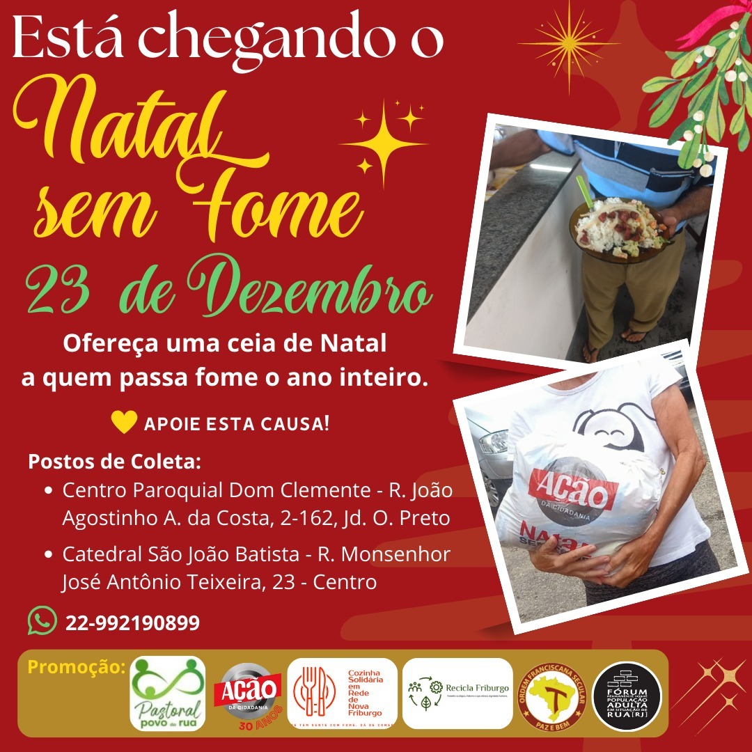 A Cozinha Solidária em Rede de Nova Friburgo realizará pelo 3º ano consecutivo o Natal sem Fome , que oferecerá uma ceia para famílias que vivem o ano inteiro em situação de insegurança alimentar. A ceia será servida no dia 23 de dezembro, às 12h30, na Paróquia São Roque em Olaria .