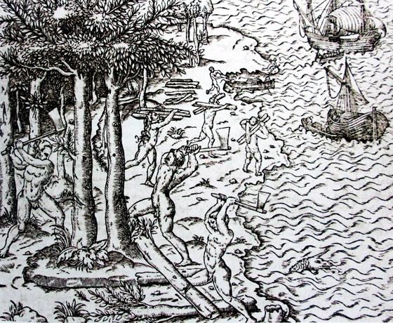 Emprego de nativos americanos para o desmatamento. André de Thévet, meados do século XVI