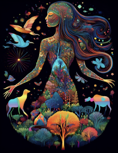 Nesta imagem gerada com IA por Rafael L. G. Raimundo, um dos autores do artigo, uma representação do conceito de ‘corpo-território’, que promove uma ideia de conexão orgânica entre a terra e as pessoas, numa teia de relações com os outros seres.